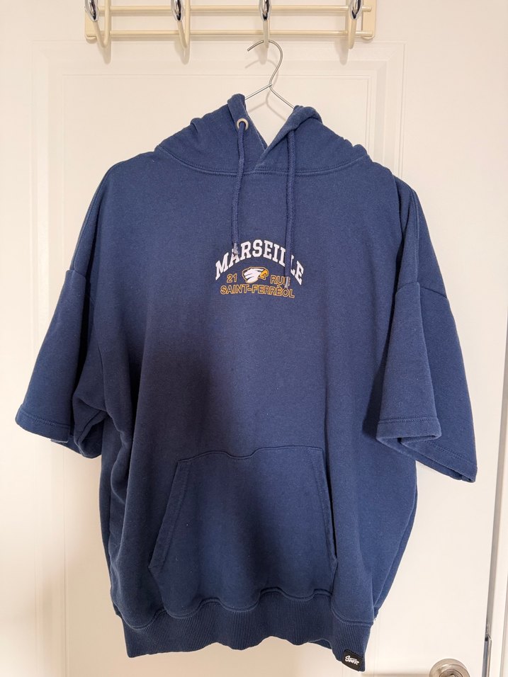 Pull&Bear kısa kollu lacivert renkli, kapüşonlu sweatshirt. Boyu 70cm, S beden. Kullanıma bağlı yıpranmaları olabilir ama hiçbir delik yırtık vs. yok