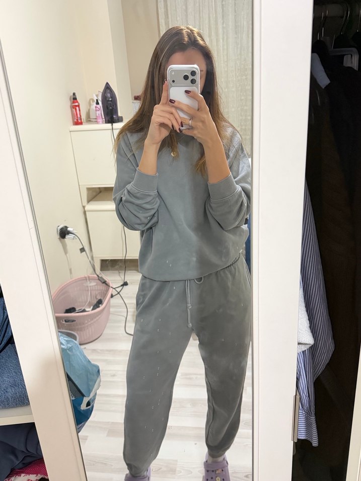 Gri renkli, uzun kollu ve yuvarlak yakalı, bol kesim kadın eşofman takımı. Hafif batik desenli ve yumuşak, sıcak kumaştan günlük kullanım için uygun.