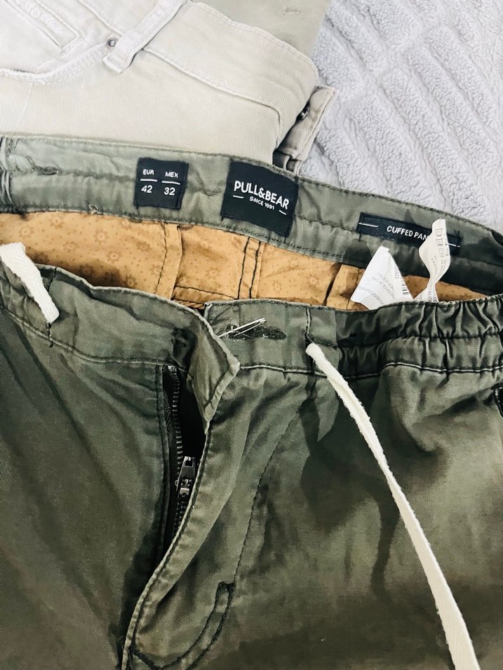 Pull&Bear marka, sentetik kumaştan rahat kesim, fermuarlı cepli, düz desenli erkek pantolon.