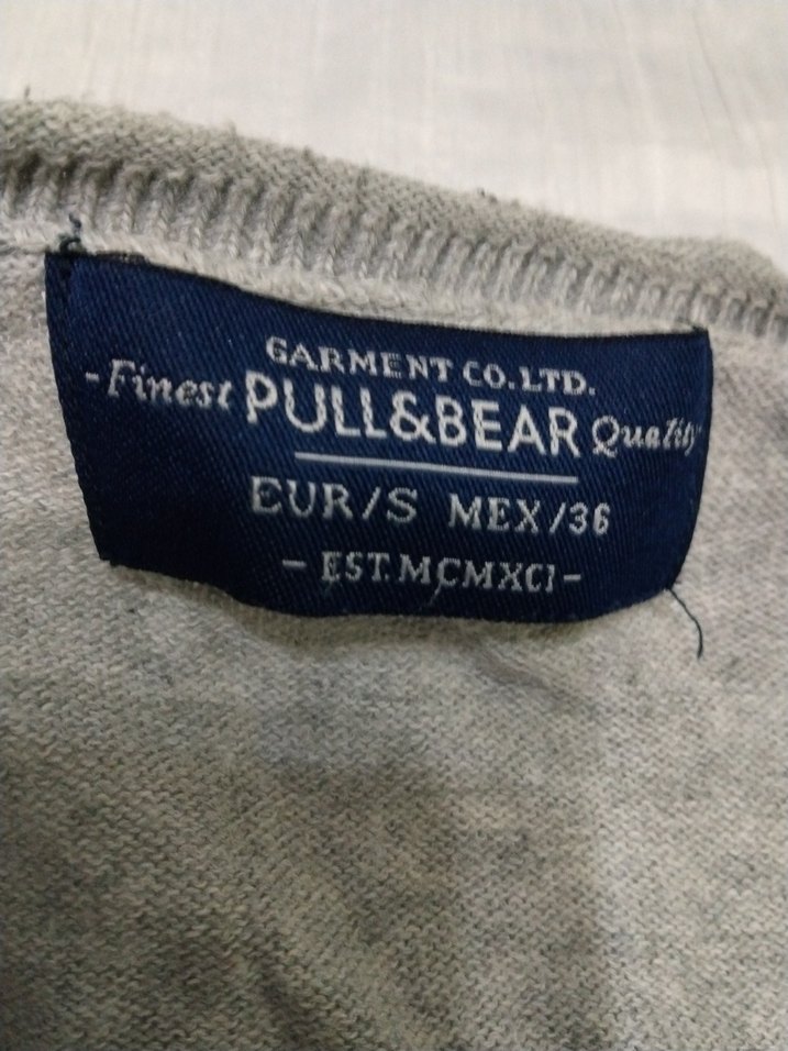 Pull&Bear markalı gri erkek rozeti, sokak giyimi tarzında ve rahat bir görünüme sahip. Etiket üzerinde EUR/S beden ve kaliteli işçilik belirtilmiş. ️