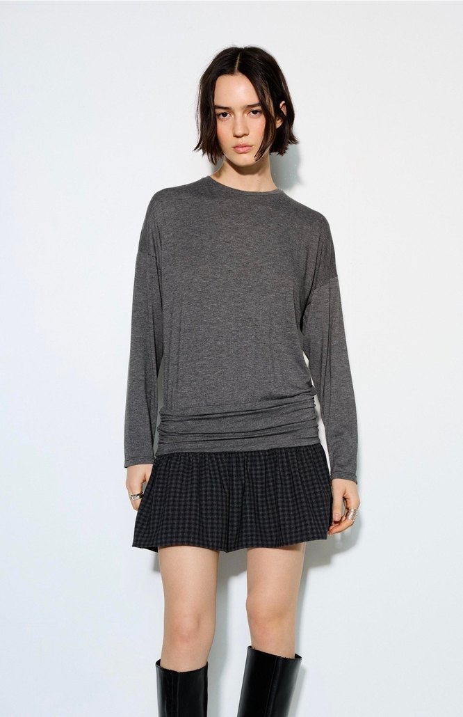 Gri renkte büzgülü tişört üst kısım ve kareli etekli bol kesim ve uzun kollu, kısa boyda kadın elbise. Günlük kullanıma uygun, rahat ve şık görünümlü bir parça.