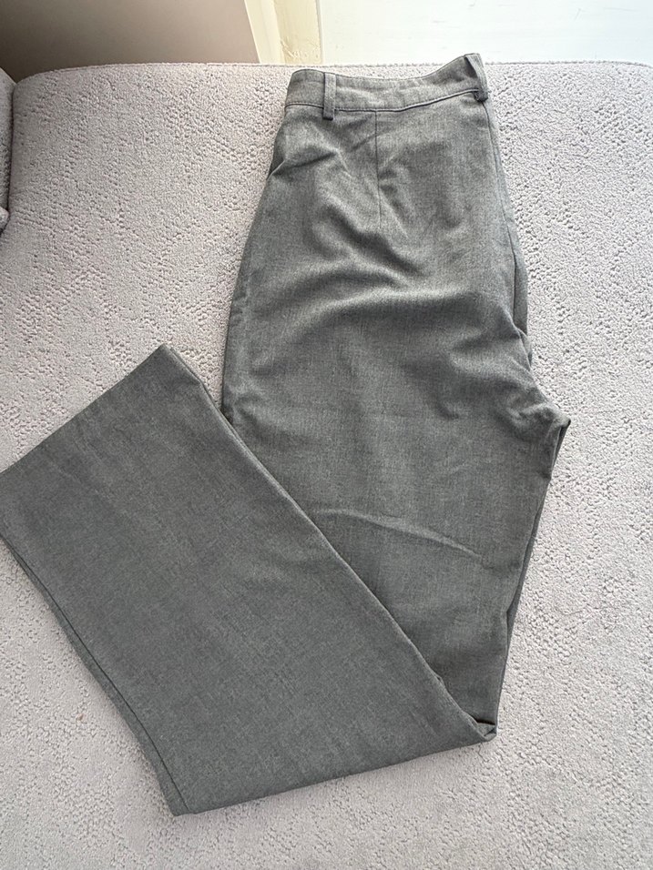 Gri keten kumaştan, midi boyda, düz kesim kadın pantolon. Minimalist ve rahat şıklık sunar, ofis için uygundur.