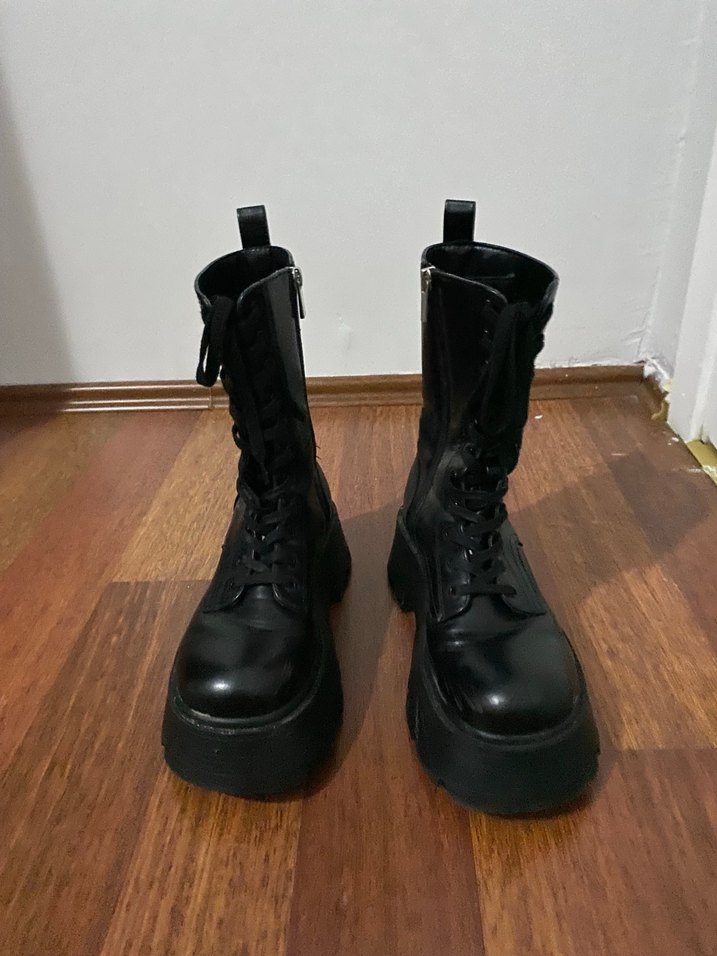 Siyah deri gotik botlar, platform topuklu ve tokalı detaylarla günlük kullanım için uygun, rock punk havası verir.