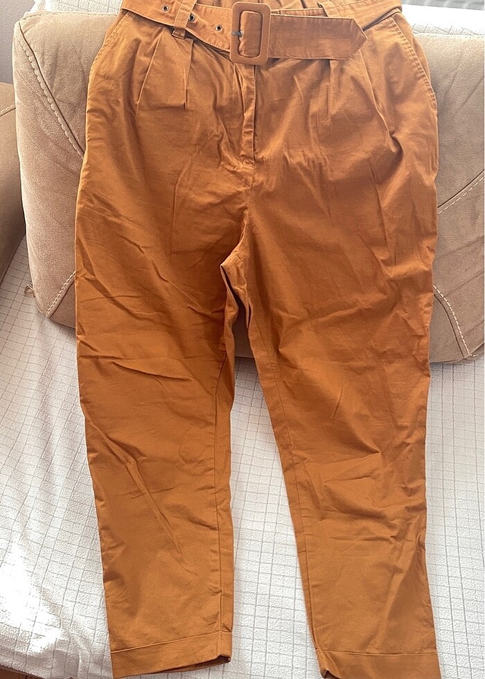 Birkaç kez giyldi. Kumaşı ince, kendi kemeri var, bedeni 40 ama 42'ye cok rahat oluyor. beli esnek.