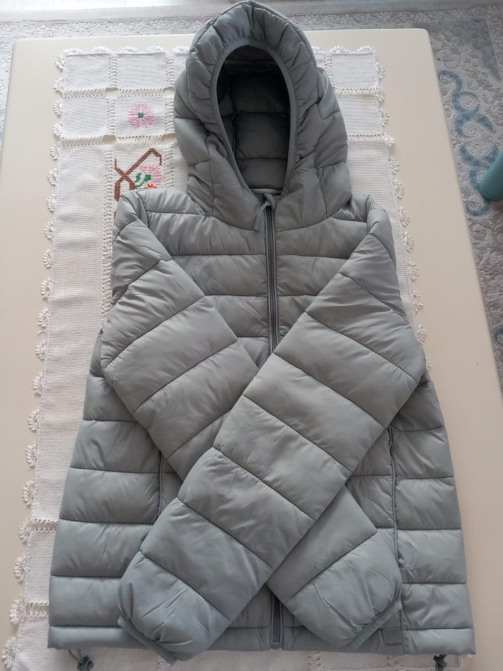 Gri renkli, kapüşonlu ve fermuarlı kadın kış montu. Yüksek yakalı, uzun kollu ve trend sokak stili için ideal, vücuda oturan kesim. Sadece 1 kez giyildi
