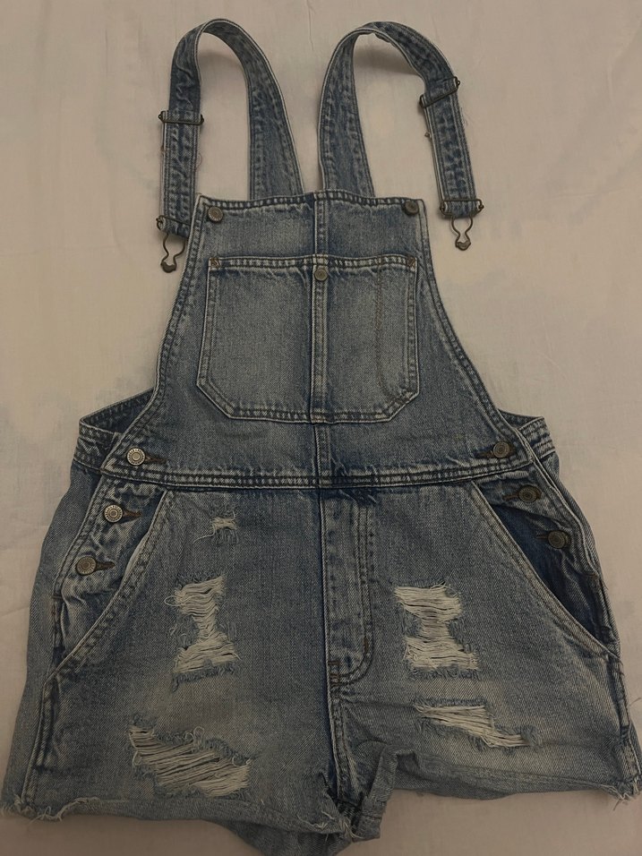 Bol kesim kot askılı şort tulum, tokalı askılar ve askısız yaka detayına sahiptir. Günlük kullanım için uygun, soluk mavi renkte rahat bir model. Model short boyu kısadır.