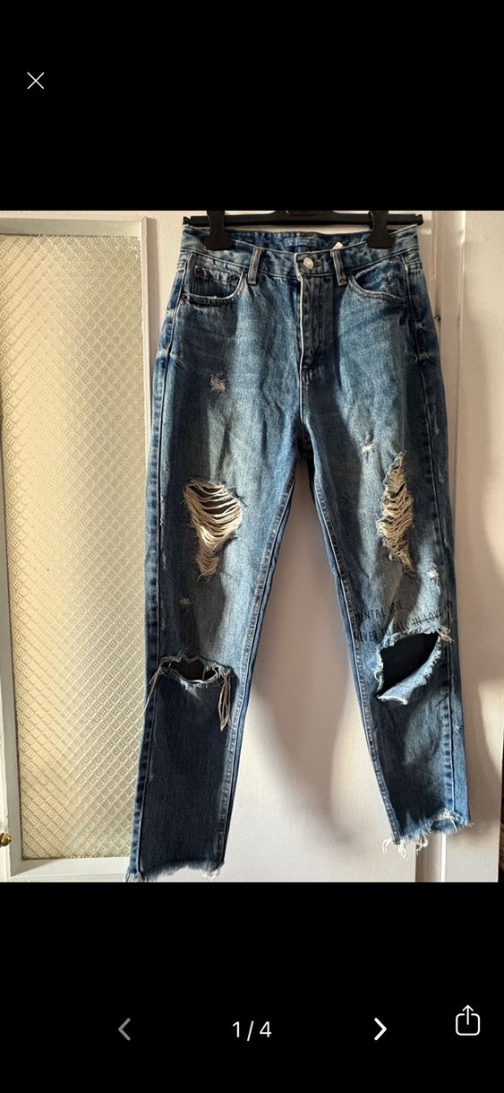 Mavi denim kumaştan,kot pantolon. Yırtık yazılı günlük kullanım için uygun.