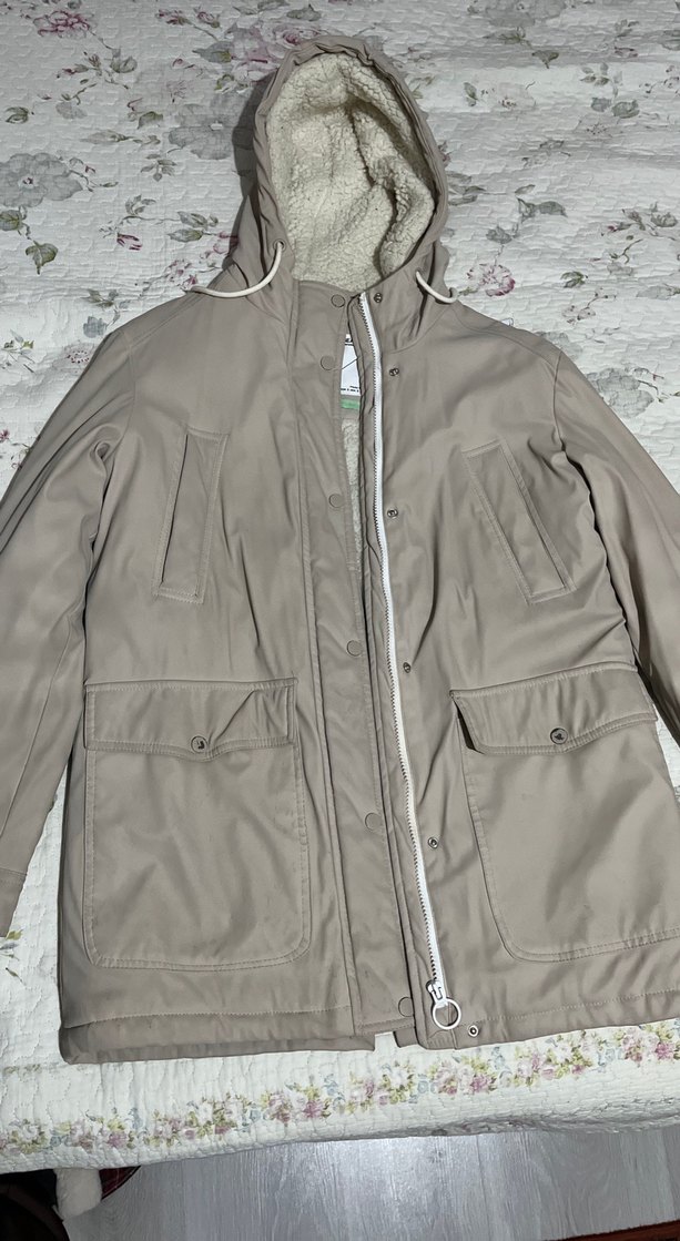 Ön cep düğmelerin biraz boyası çıkmış. Cebin biraz çizgi lekeleri var yıkansa çıkabilir. Çok kalın içi polarlı, polar kısmın da görseldeki gibi siyah kısımlar var leke değil kıyafetlerin tüyleri, bir kere yıkadım çıkmadı tüy toplayacı ile büyük ihtimal çıkar. Eksi bütün özelliklerini yazdım yırtık gibi bir şeyi yoktur.