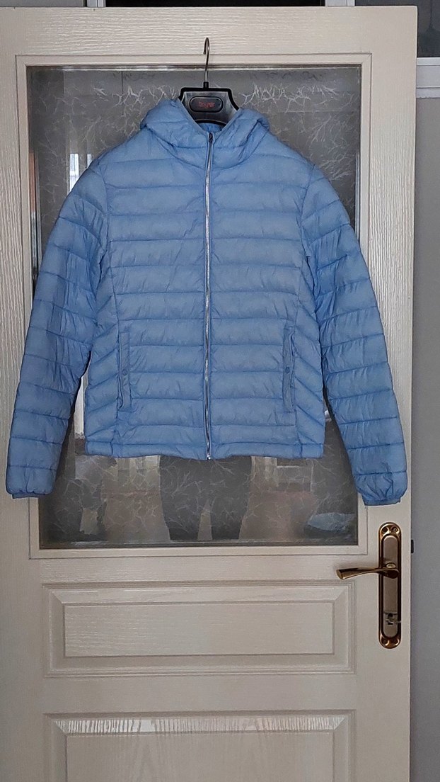 Kadın mont, fermuarlı ön ve kapüşonlu, yumuşak, hafif kumaştan yapılmıştır. Mavi renkte, fitted kesim ve uzun kolludur, rahat dış mekan kullanımı için uygundur. Bebe mavisi tertemiz lekesiz önde çıtçıtlı iki adet cep içte açık iki adet cep mevcuttur görsellere en boy eklenmiştir