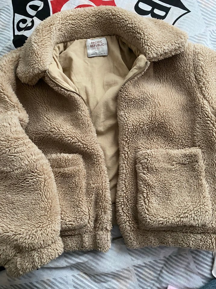 Bej renkli, uzun kollu, gevşek kesim kadın peluş ceket. Yumuşak ve sıcak kumaştan, tüy detaylı, iki ön cepli, midi boyda rahat bir dış giyim ürünü.