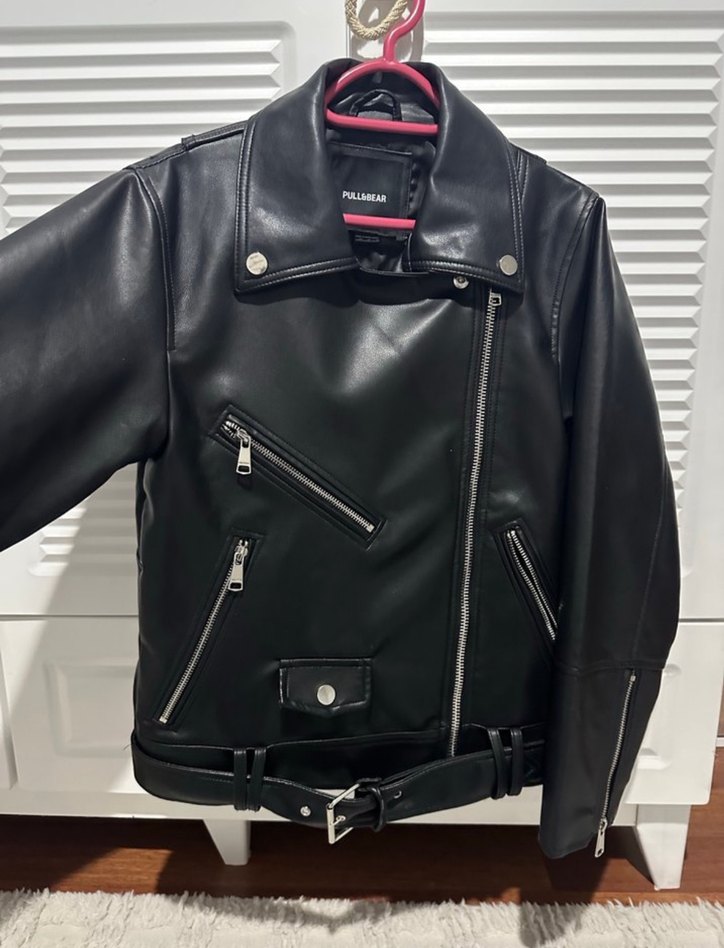 Bu siyah deri biker ceket, oturmalı kesimi, kesikli yakası ve tokalı detaylarıyla grunge punk tarzını yansıtıyor. Askılı kolları ve fermuarlı cepleriyle günlük kullanım için şık ve asi bir görünüm sunar.