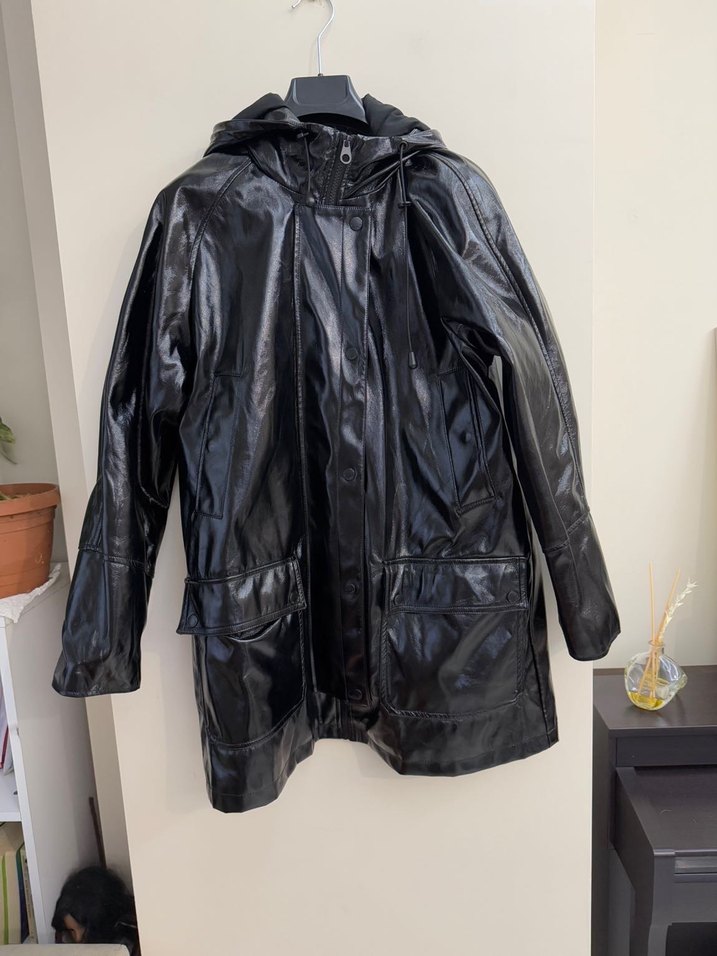 Siyah deri kadın yağmurluk, bol kesim, uzun kollu ve kesik yaka detaylıdır. Kemerli ve midi boyda, günlük sokak stiline uygundur. ️