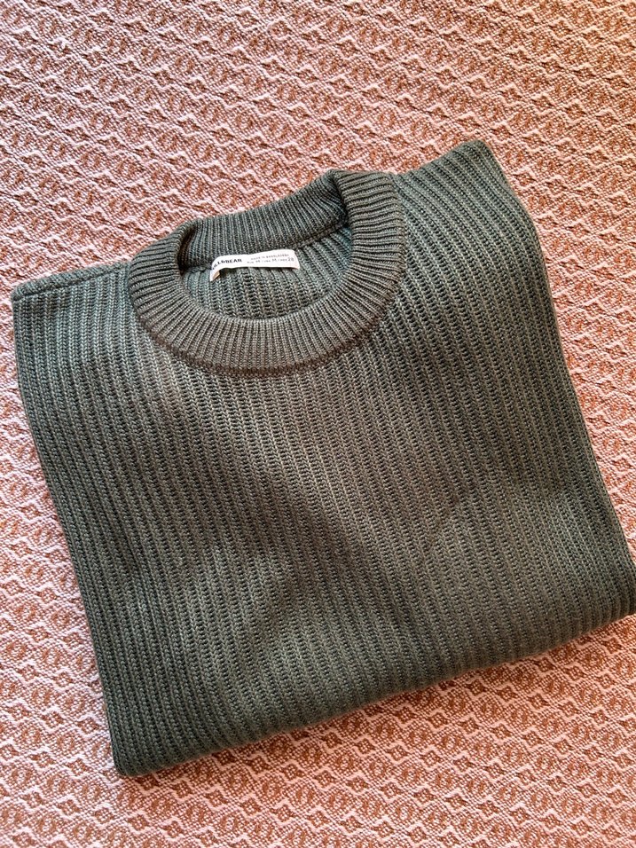 Gri renkli, örgü kumaştan yapılmış, bisiklet yaka ve uzun kollu, bol kesim kadın kazak. Desensiz ve rahat kullanıma uygun. Hiçbir deformesi yok