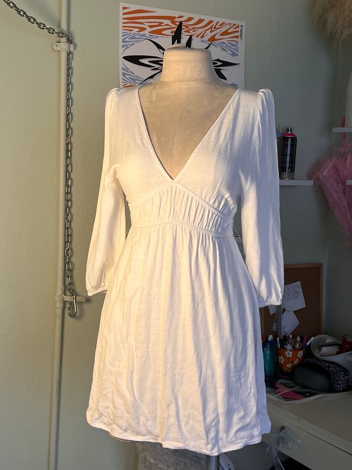 Pamuklu, V yakalı, uzun kollu, bol ve drapeli beyaz elbise. Midi boyda, minimalist ve bohem tarzda, günlük kullanıma uygun. Melek gibi hissettiriyor yıldönümüm için alıp bir kez giydim