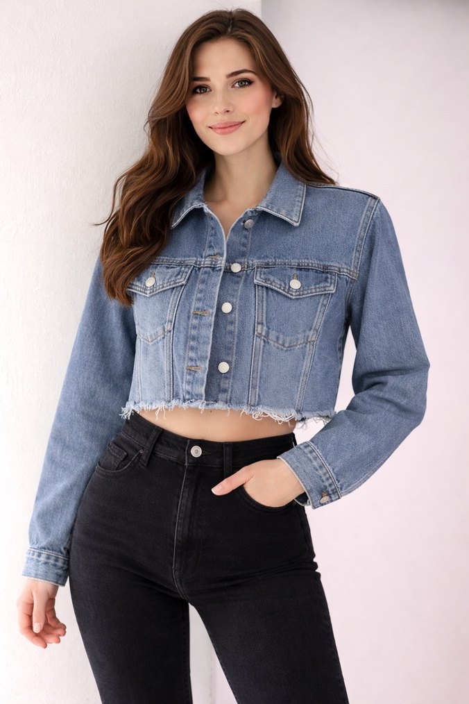 Bu mavi denim ceket, uzun kollu ve düğmeli, notalı yaka detayına sahip. İki ön cep ve salaş kesimiyle gündelik tarz için uygun. Modelin cropped, modası geçmeyen açık mavi kot rengi. Alt püskül detaylarıda mevcuttur. Orijinal markadır.