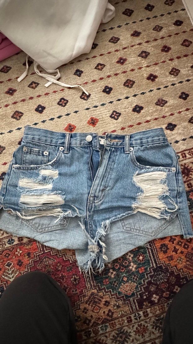 Bol kesim, kısa boy yırtık detaylı denim şort. Mavi kumaş üzerinde hafif batik desenleri ve bağlamalı toka detayı bulunur. Bohem sokak stili için uygun.