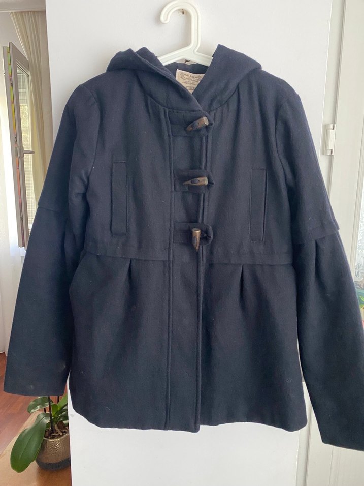 Sayili kullanildi, iki koltukarasi 47 cm dir. Kapüşonlu ve çıtçıtlı lacivert kaban, soğuk havalar için yumuşak ve sıcak kumaştan yapılmıştır.