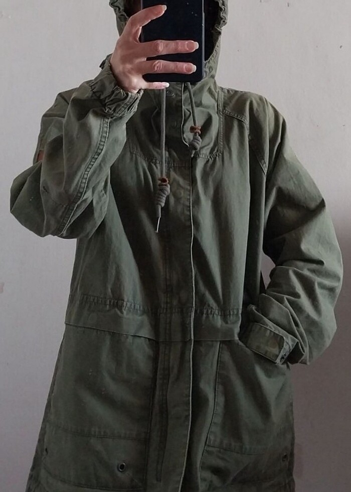 Haki yeşili, fermuarlı ve gizli çıtçıtlı. kapüşonun ense kısmında sararmalar var, bir de ilk boyundaki ilk çıtçıtın karşılığı yok,fotolarını ekledim. bunun dışında eksiği yok. iki kol altı 57 cm,boy 74 cm.