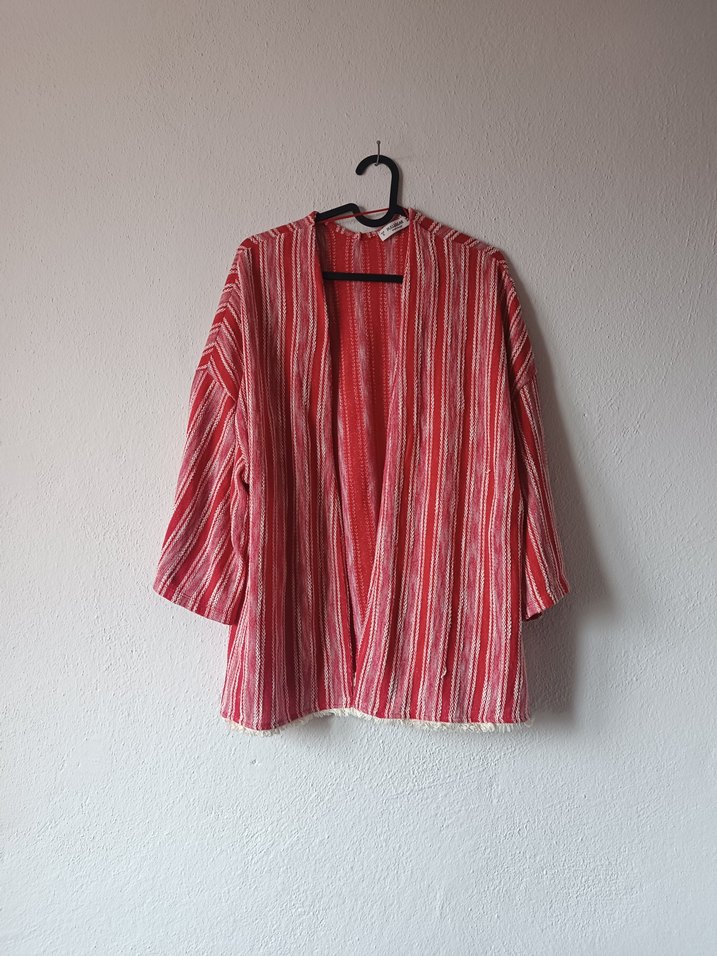 Pull & Bear marka uzun kollu, çizgili desen salaş kesim kadın kimono. Önü açık ve yanlardan yırtmaçlı. Renkli batik desenli ve püsküllü detaylarla bohem, rahat bir tarz sunar. Midi boyuyla günlük kullanıma uygundur. İki koltuk arası genişliği 56cm, boyu 65 cm dir. S beden. Yüzde 47 pamuk 28 akrilik 25 polyester. Bu sayfadaki ürünler, ek gelir amaçlı satışta değildir. İkinciel butik satış fiyatlarıdır ve bu sebeple fiyat sondur. Sadece toplu alımlarda indirimden faydalanabilirsiniz. (üç ürün yüzde 5, beş ürün yüzde 15) Aynı gün kargoya verilir. Instagram: @namaste.vintage