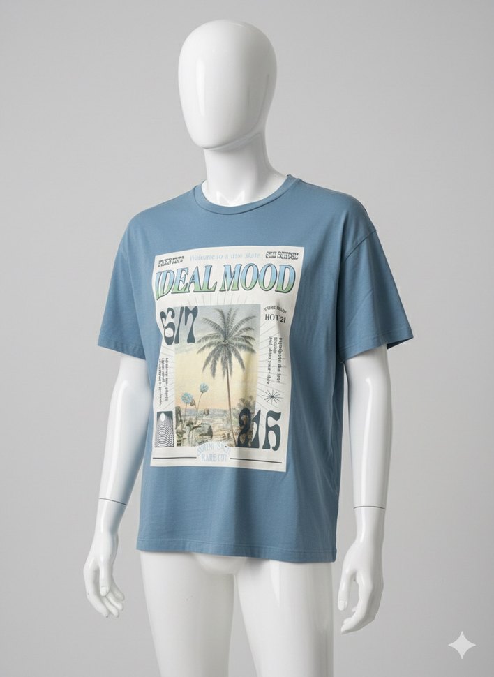 Mavi pamuklu tişört,kısa kollu ve bisiklet yaka. Üzerinde 'İDEALMOOD' yazılı baskı bulunur. Günlük rahat kullanım için uygundur. Üründe çamaşır suyu lekesi vardır ilk fotoğraf görsel amaçlıdır fiyat bu yüzden uygundur iki koltuk arası 54 santim boyu 62 santim ab