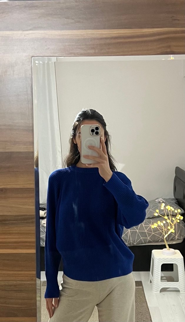 Koyu mavi triko kumaştan, yuvarlak yaka ve uzun kollu, salaş kazak, günlük kullanıma uygun rahat şıklık sunar.