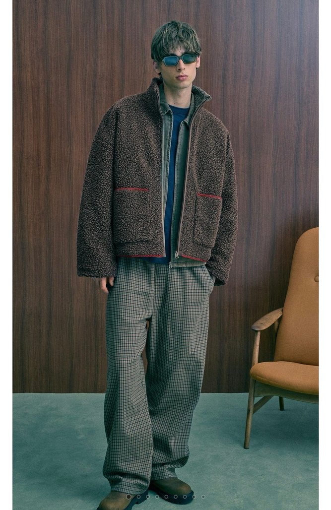 Kahverengi, bol kesim, uzun kollu, kürk detaylı ve yakalı erkek yumuşak kumaş ceket, günlük kullanım için uygun.