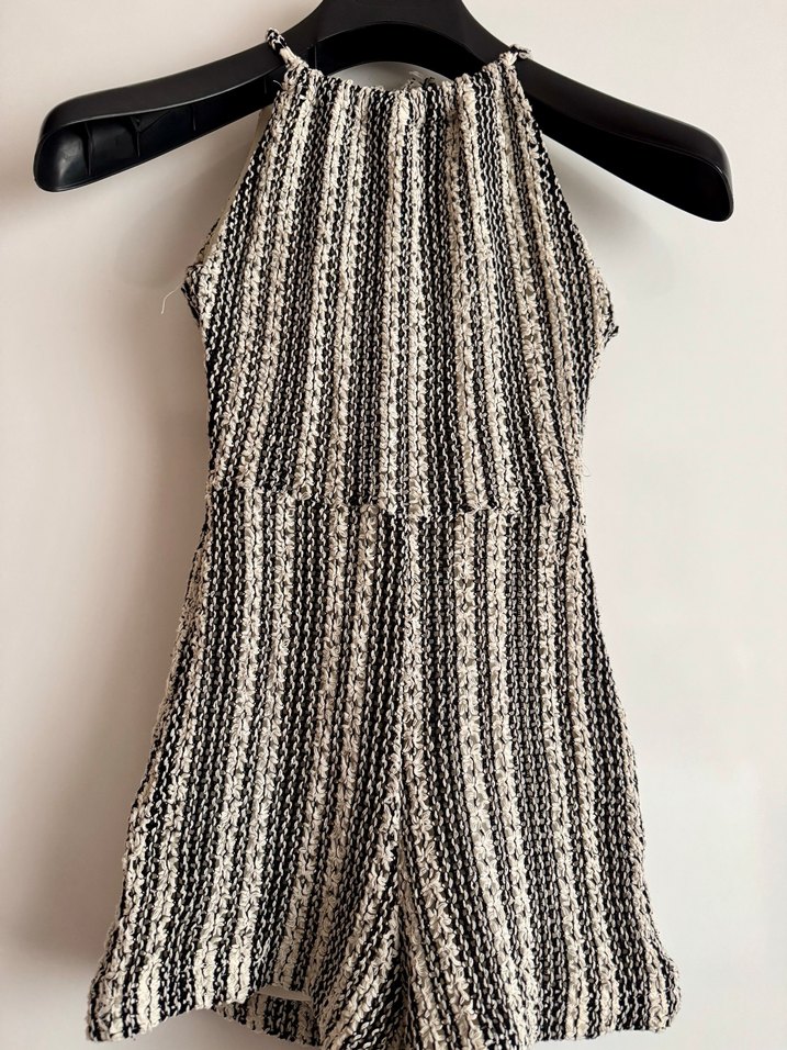 Yakası ayarlanabilir, arkadan iple bağlanıyor, hafif bir sırt açıklığı detayı var. Örgü dokusu çok şirin bir şort tulum. Xs beden, minyon-zayıf biri için uygun olur