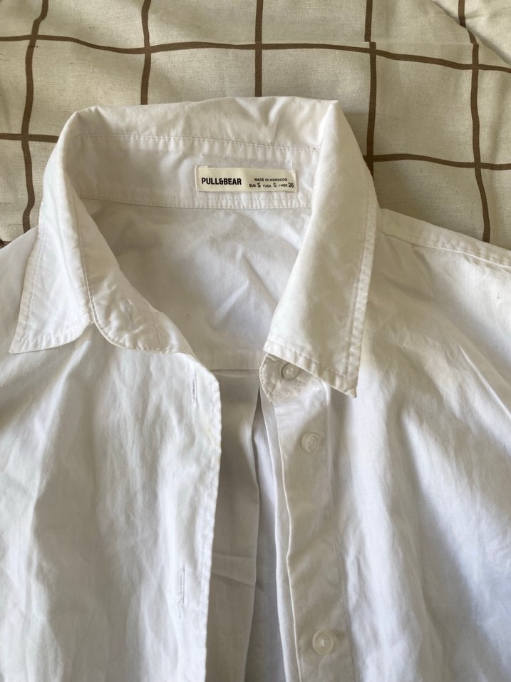 Beyaz keten kumaştan, düğmeli gömlek. Minimalist tarzda, günlük kullanıma uygun.