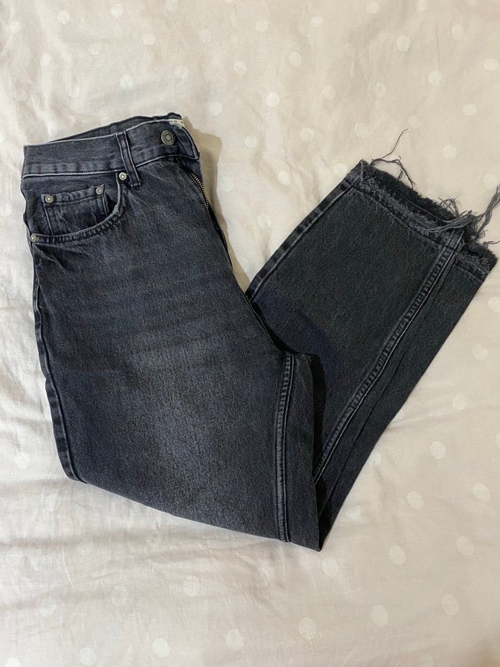 Gri renkte ve midi boyda, paçaları kesik kadın jean.pens dikişleri mevcuttur ön sağ cep yanında bir deforme mevcuttur ama kullanıma engel bir durum yoktur.Fermuar kısmında cekme yeri kopuktur buda kullanıma engel degildir.Alıcıya şimdiden hayırlı olsun✨
