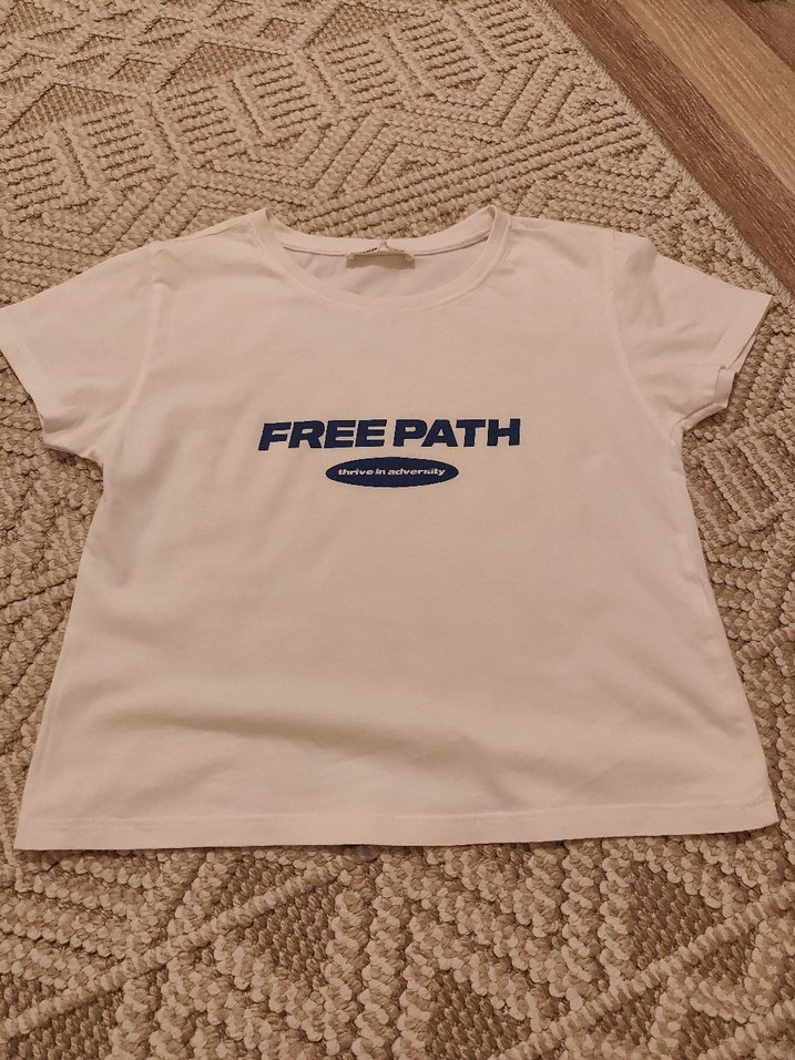 Bej pamuk tişört, kısa kollu ve yuvarlak yakalıdır. Önünde "FREEPATH" baskısı bulunur, rahat ve günlük kullanım için uygundur.