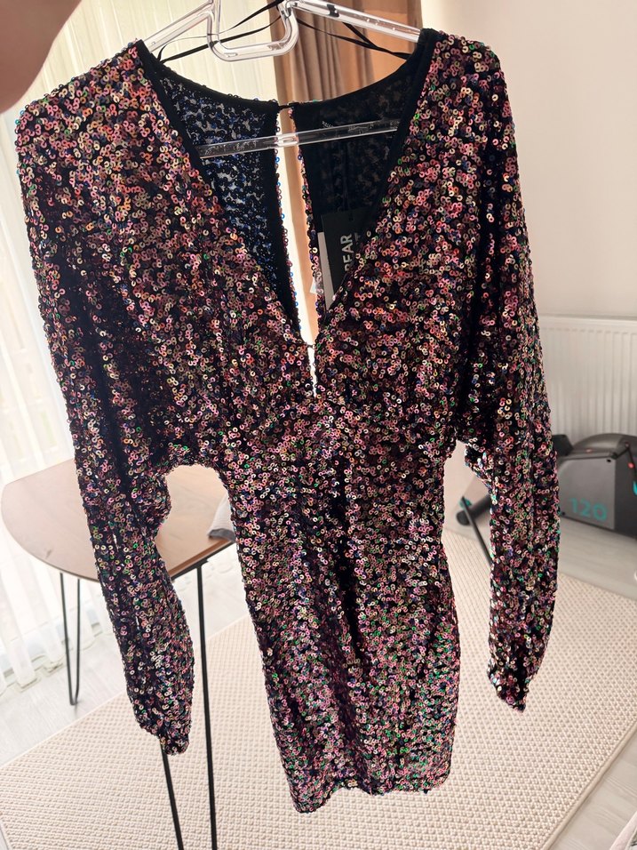 V yakalı, uzun kollu, vücuda oturan mini elbise. Çok renkli ışıltılı desenlerle süslenmiş, bohem ve göz alıcı tarzda, romantik akşamlar için ideal. ✨