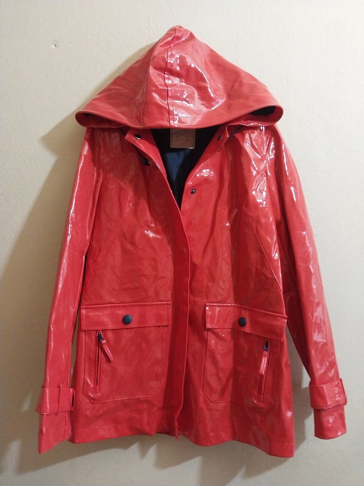 Kırmızı rugan yağmurluk kapşonlu arkasında ara ara siyah dalgalanma mevcut kullanıma engel degildir onun dışında cok guzel S beden kol altı mesafesi 48 cm boyu 72 cm