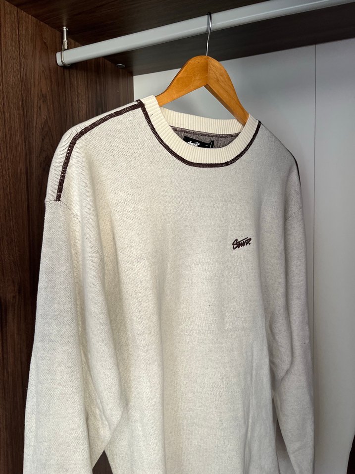 Erkekler için beyaz pamuklu triko kazak, yuvarlak yaka ve uzun kolludur. Salaş kesimi ve ince gri detaylarıyla rahat ve günlük kullanıma uygundur.