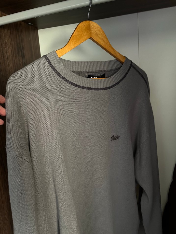 Gri renkli, bisiklet yakalı, bol kesim uzun kollu triko kazak. Yumuşak ve sıcak kumaştan, gündelik sokak stili için uygundur.