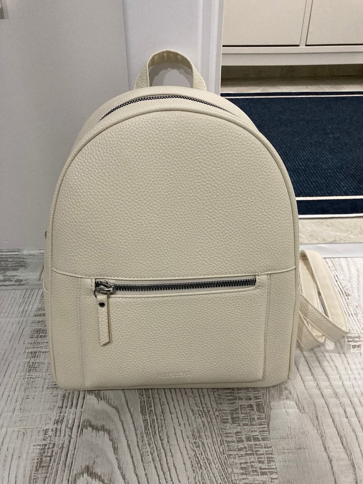 Minimalist beyaz deri sırt çantası, fermuarlı ön cep ve ana bölme ile günlük kullanım için uygun, sade ve sokak stili uyumlu.