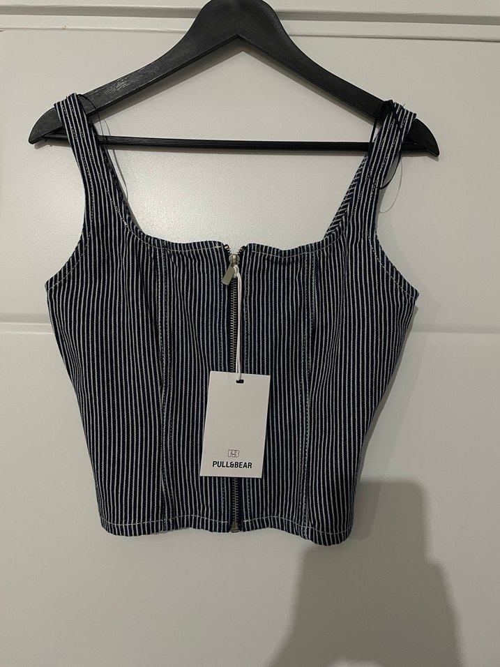 Pull&Bear markalı, fermuarlı ve çizgili desenli siyah crop top, straplez yaka ve dar kesimiyle günlük şıklık sağlar.