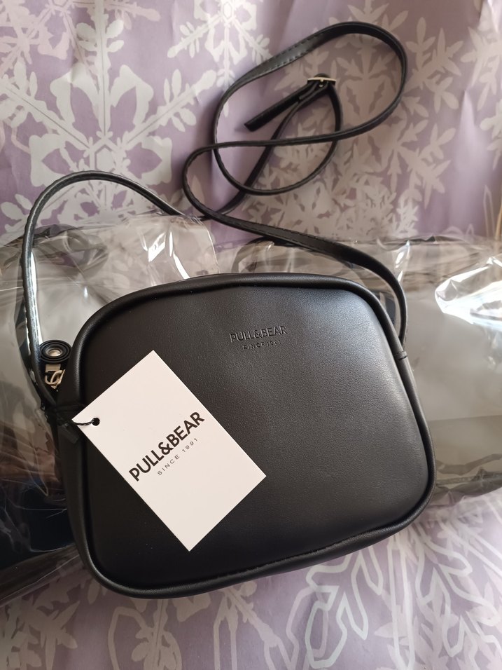 PULL&BEAR markalı siyah deri biker çanta, tokalı ve baskılı detaylara sahip. Trendy casual tarz ve günlük kullanım için uygundur.