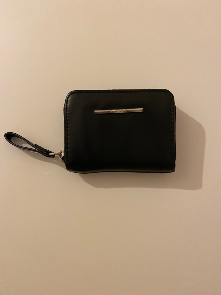 Siyah deri kadın cüzdanı, fermuarlı kapama özelliğine sahip. Minimalist ve goth tarzda, günlük kullanıma uygun sade ve desensiz tasarım. Sadece kullanıma bağlı olarak ön amblem kısmında atma mevcuttur onun dışında herhangi bir kusuru yoktur