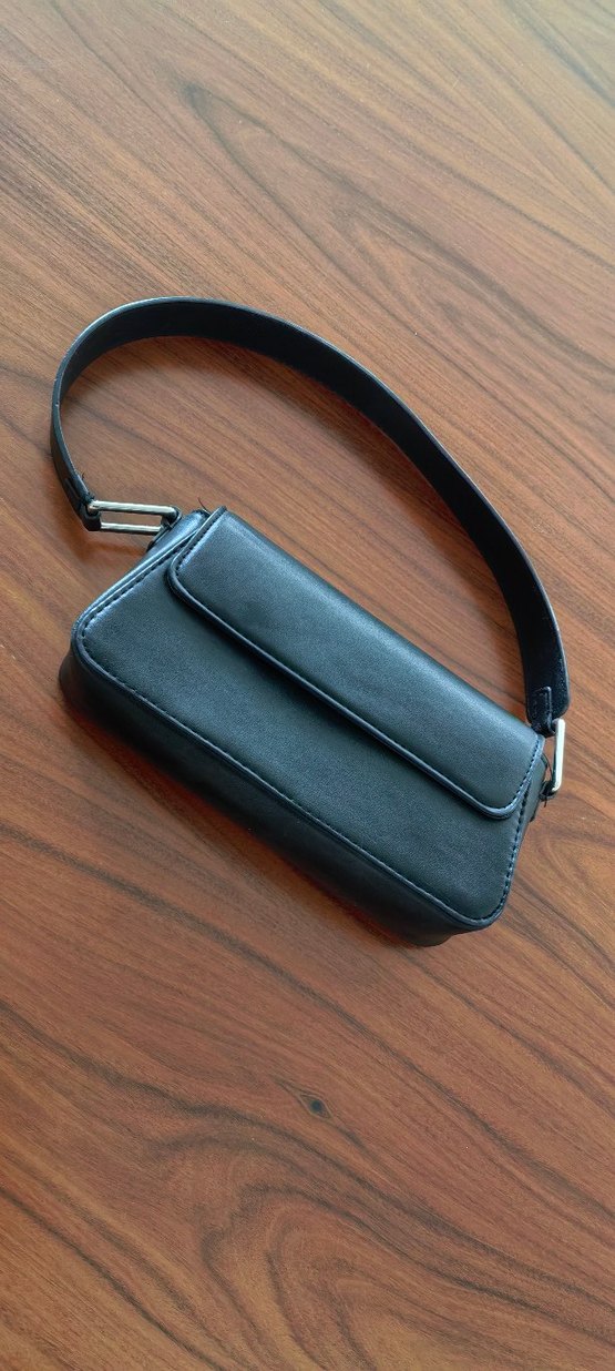 Siyah deri kadın omuz çantası, tokalı kayış ve sade deseniyle günlük sokak stiline uygundur. Az kullanıldı.