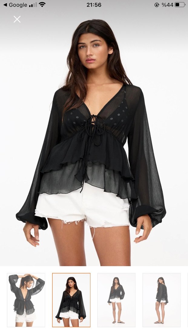 Siyah, V yakalı, bol kesim ve uzun kollu fırfırlı mini bluz. İpeksi kumaş ve batik desenle bohem gotik tarzı yansıtıyor, romantik akşamlar için uygun. Sıfır hiz giymedim