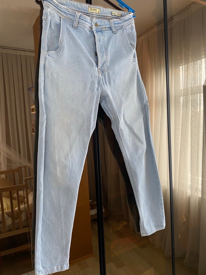 Kadınlar için pastel mavi renkte, düğmeli, regular fit midi boy kot spantolon. Günlük rahat kullanım için sade ve desensiz tasarıma sahip.