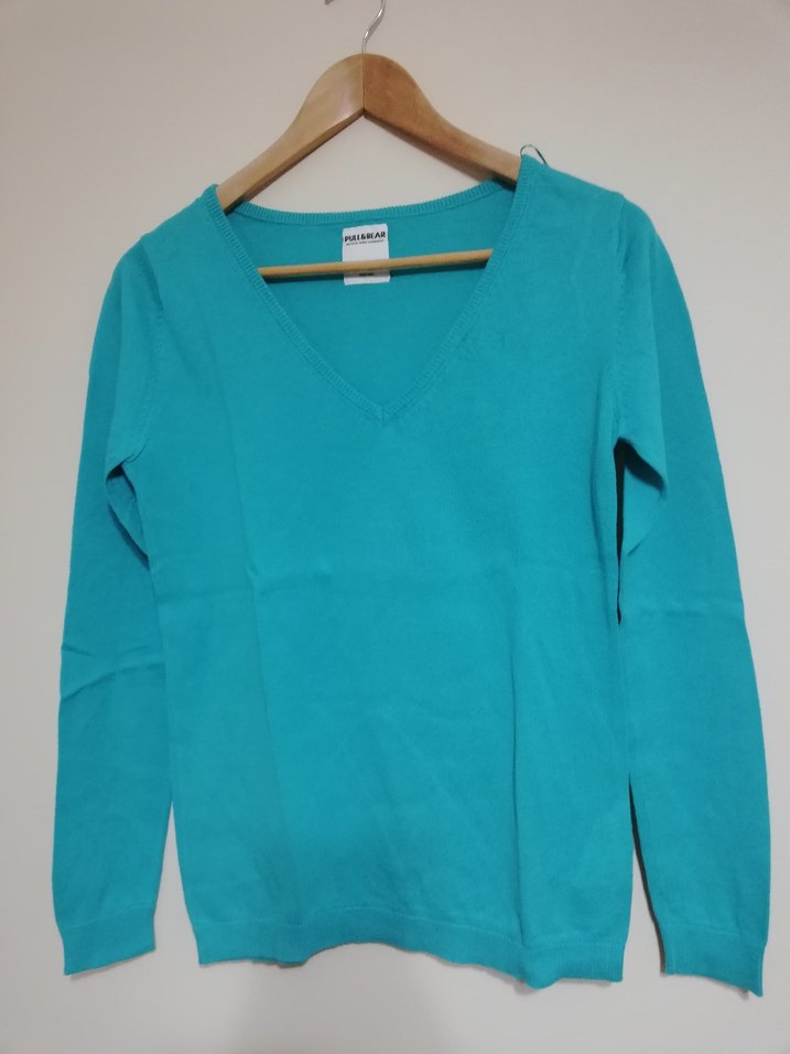 Turkuaz renkli, V yakalı ve uzun kollu kadın kazak, rahat kesimiyle günlük kullanıma uygundur. Yumuşak ve ince bir dokusu vardır. S beden. Az kullanılmıştır. Temiz ve iyi durumdadır. Pull&Bear markadır.