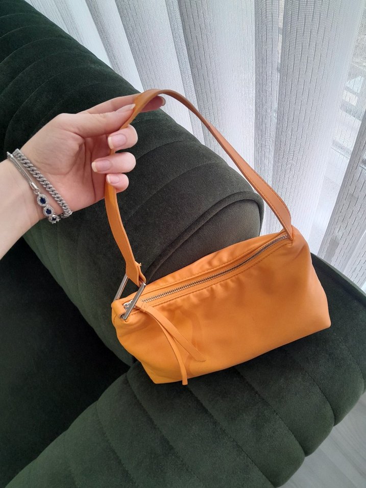 Pastel turuncu renkte, fermuarlı ve minimalist tasarıma sahip deri kadın çantası, günlük sokak stiline uygun.