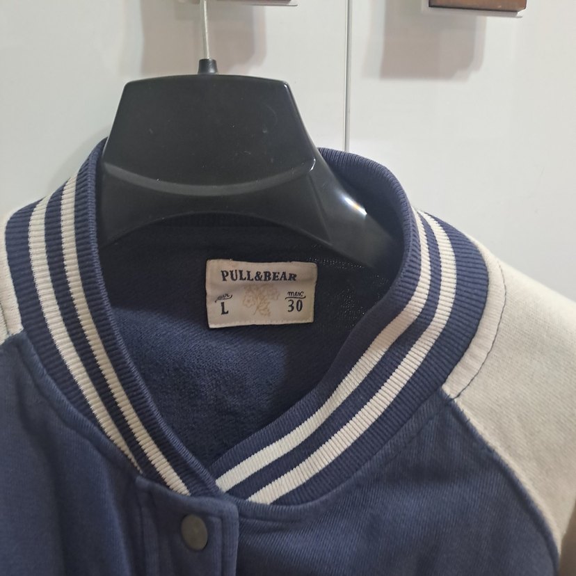 Pull&Bear markalı, gri ve mavi renklerde, çizgili ribanalı yakaya ve çıtçıt düğmelere sahip kadin spor ceket.