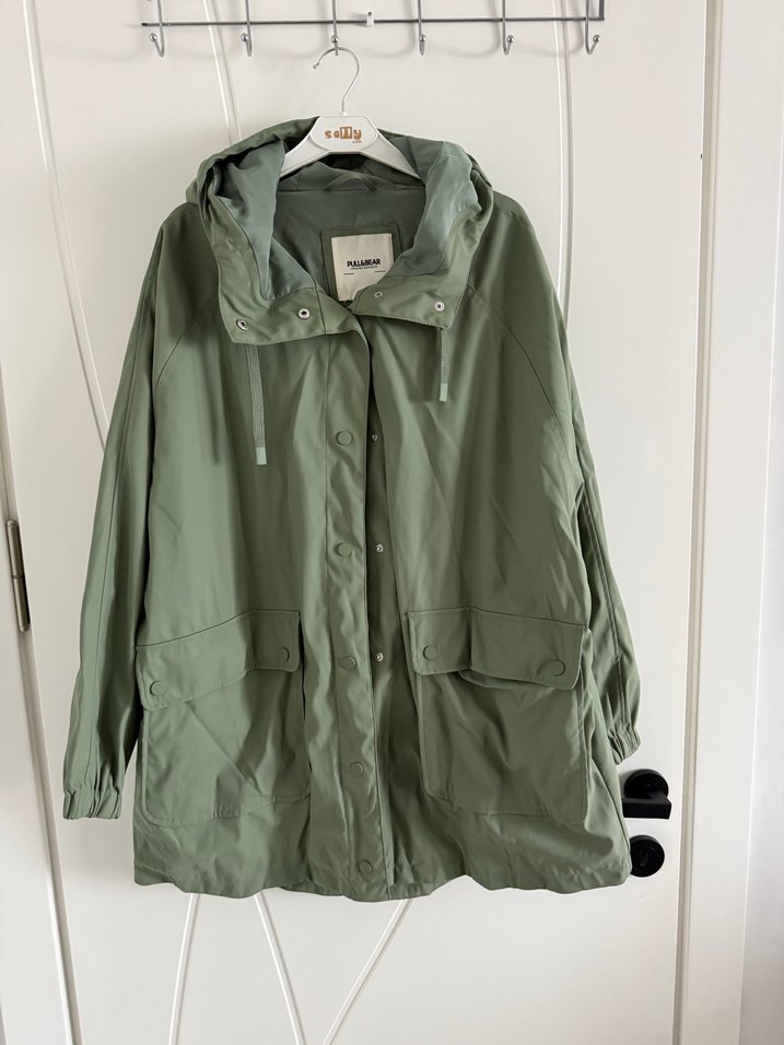 Düğmeli, uzun kollu, yeşil midi yağmurluk. Rahat kesimli ve kapüşonlu, yaka detaylı, kauçuk kumaştan outdoor kullanıma uygun. Su geçirmez. Oldukça oversize’dır bol kesimdir. Etikete aldanmayın Ölçüleri yazıyorum: Boy:82 En:60 cm İçten sıkmalı iplidir. Bel kısmını daraltabiliyorsunuz. Ben hiç kullanmadım ama kargodan etiketsiz gelmişti.