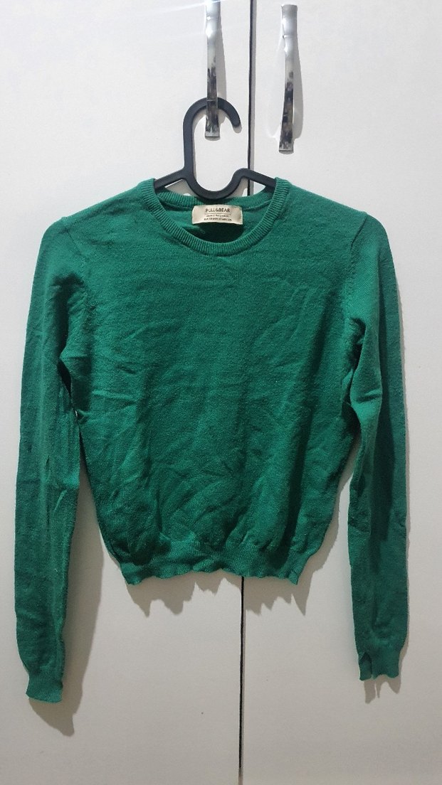 Bu yeşil, uzun kollu, bisiklet yaka kazak, yumuşak yün dokusuyla örülüdür ve günlük kullanım için uygundur.