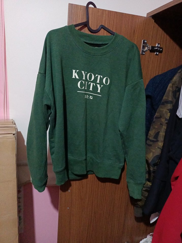 Yeşil renkli, pamuklu ve örme dokulu sweatshirt, bol kesim ve yuvarlak yaka ile. "KYOTO CITY" baskılı, günlük ve sokak stiline uygun. M beden