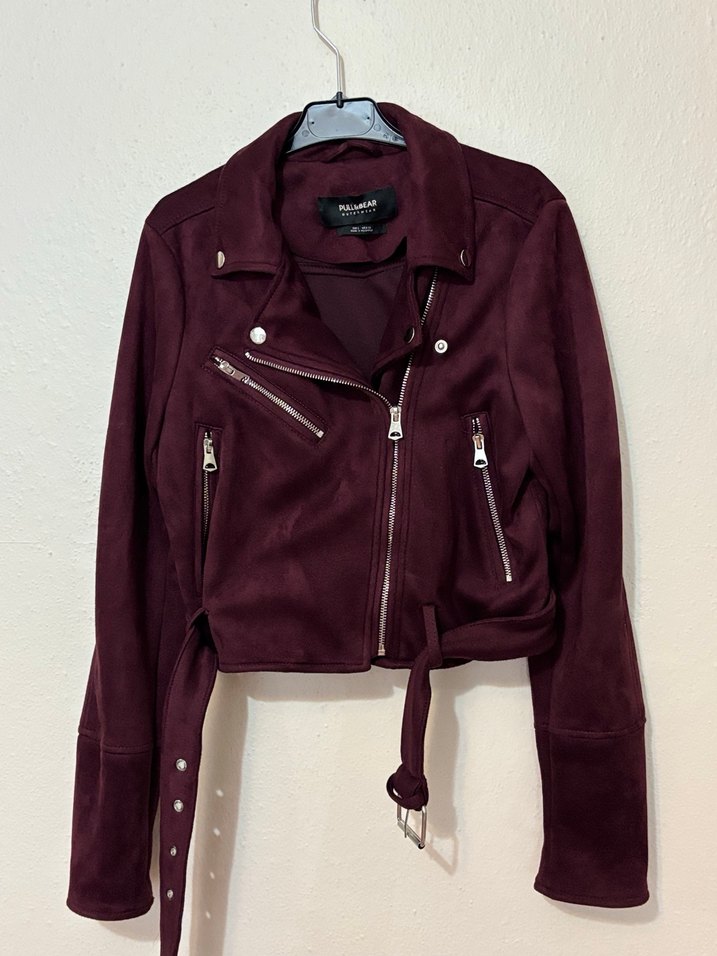 Bordo süet biker ceket, kemerli ve strappy kollu, fitted kesim. Notched lapel ve fermuarlı ceplerle minimalist ve trend görünüme sahip.