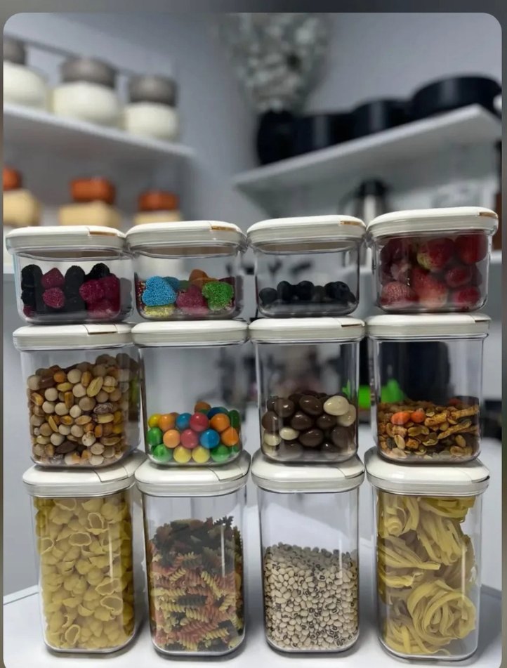 Cooknkeep Farklı boylarda, beyaz kapaklı şeffaf pull box saklama kapları seti. Makarna, kuruyemiş ve şekerleme gibi malzemeleri düzenlemek için uygun. 4 adet1,5 lt 4 adet 1 lt 4 adet 500 ml