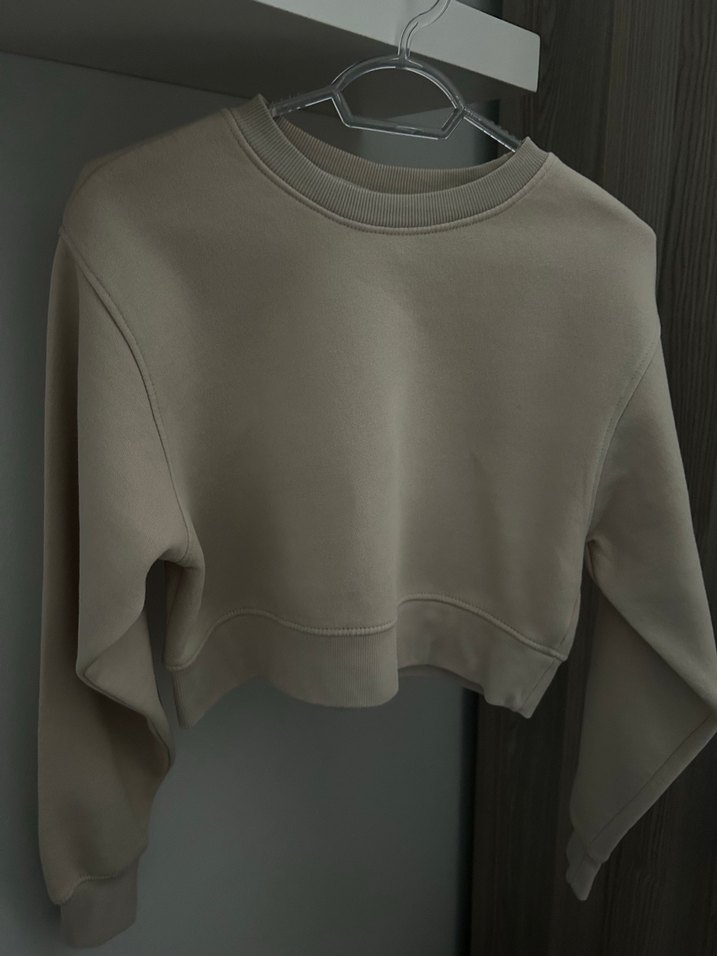 Bej renk, yuvarlak yaka ve uzun kollu kadın crop sweatshirt. Rahat sentetik kumaştan, günlük sokak stili için uygun. Hiç giyilmedi defosu yoktur